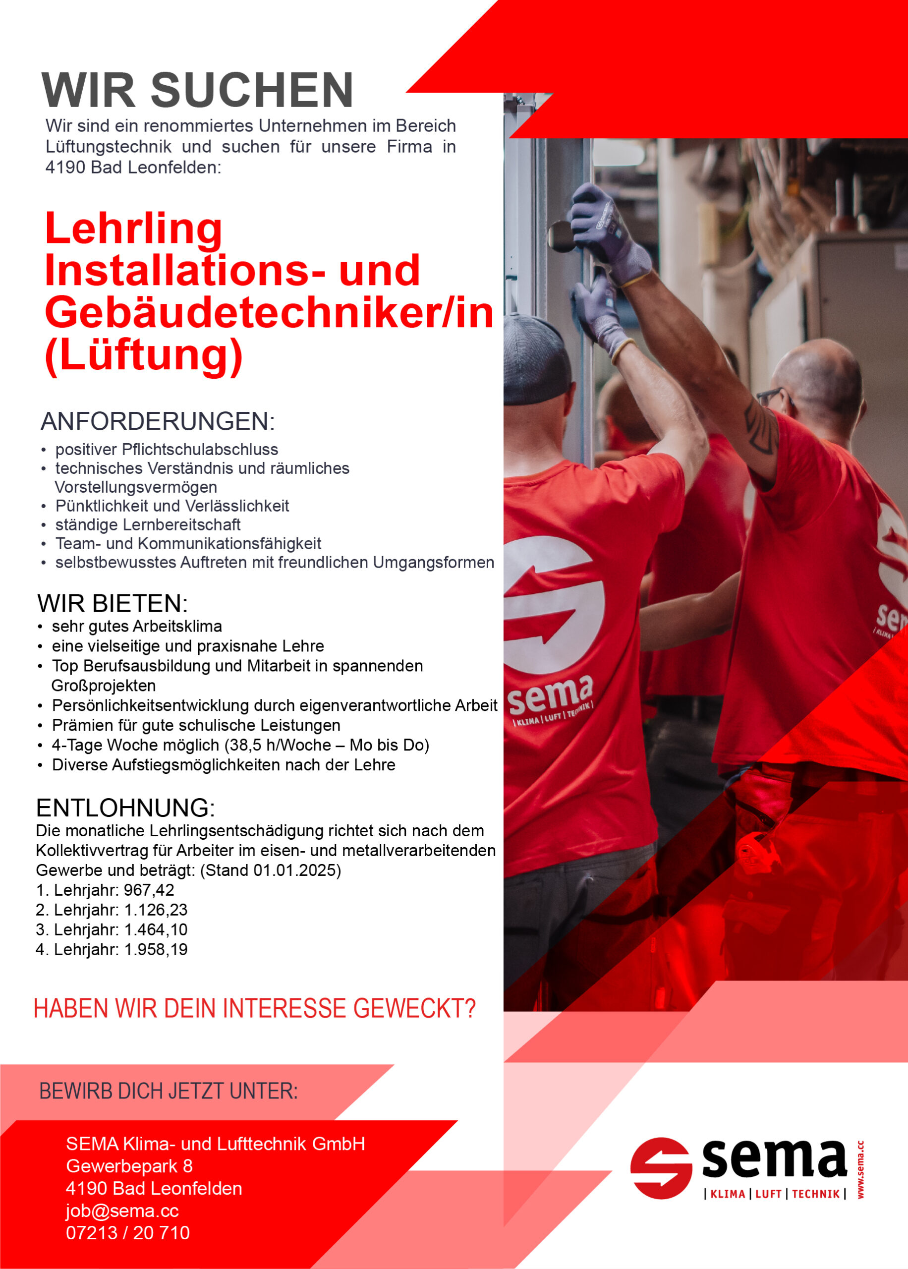 Sema Klima- und Lufttechnik GmbH | Bad Leonfelden  »  Allgemein  »  Lehrling Installations- und Gebäudetechniker/in (Lüftung)