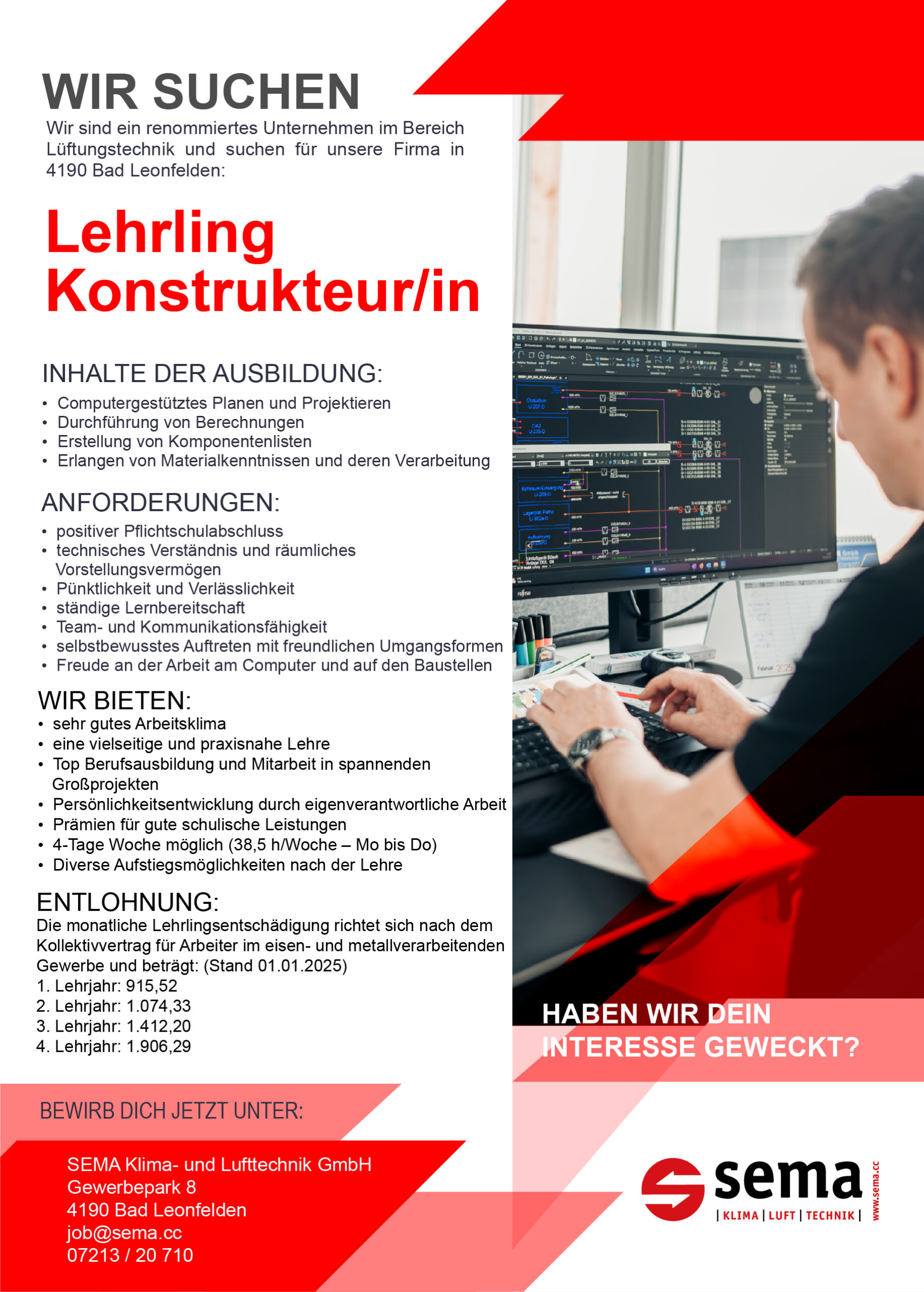 Sema Klima- und Lufttechnik GmbH | Bad Leonfelden  »  Allgemein  »  Lehrling Konstrukteur/in